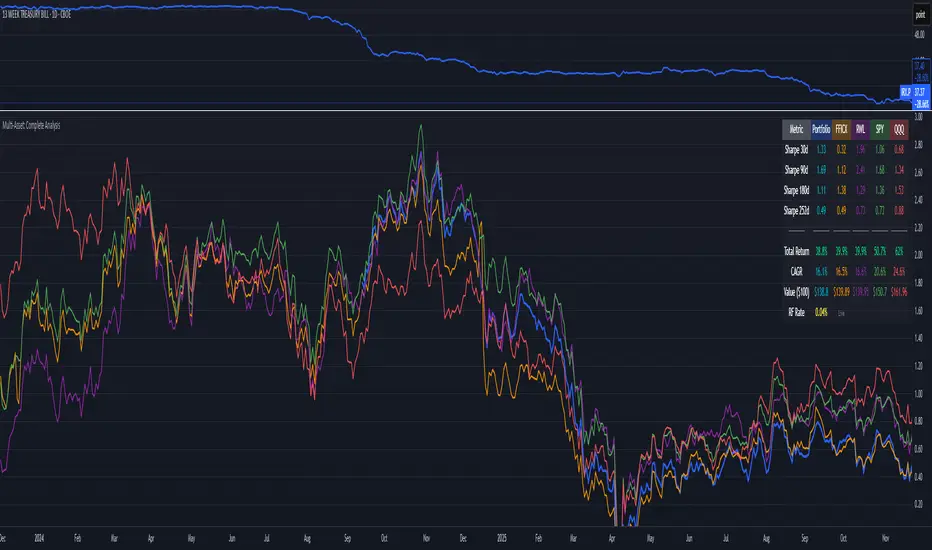 Comprehensive performance analysis tool for comparing multiple assets or custom weighted portfolios against benchmarks. Calculates Sharpe ratios across multiple timeframes (30d, 90d, 180d, 252d), total returns, CAGR, and normalized values starting from $100.