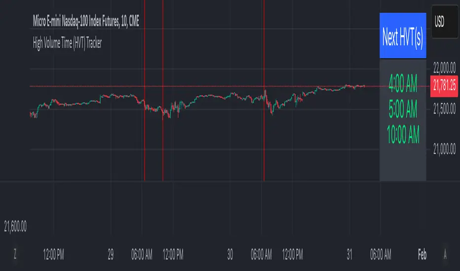 This Indicator displays the upcoming HVT for the NasDaq on a table. The HVT is also displayed on the chart in real-time in order to help accentuate the best times to trade and a clear picture for the daily directional move. This times were found manually and bear as much significance as I bring it to have. These are not guaranteed times for the market to move, but rather High Probability Times based on my own backtesting on NQ.