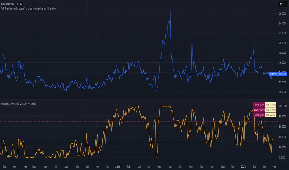 This indicator helps traders identify where the current price stands relative to its historical context using percentile ranking. It calculates and displays the current price's percentile position within a customizable lookback window (default: 365 periods).