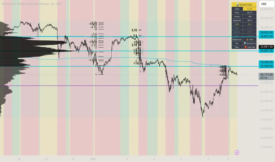 The Daily Range Risk Filter is a TradingView indicator that measures intraday range consumption to help traders assess how much of the day’s potential movement has already occurred. It provides a visual heatmap, session-specific analysis, and probability metrics to guide risk management and prevent overtrading.