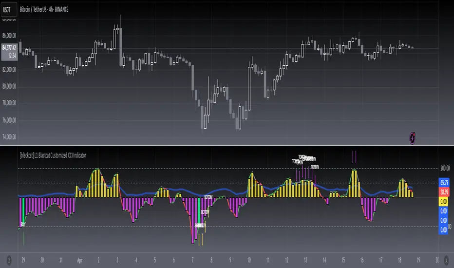 OVERVIEWThe [blackcat] L1 Blackcat Customized CCI Indicator is a comprehensive technical analysis tool that combines the Commodity Channel Index (CCI) with additional features for enhanced trading insights. 📈
