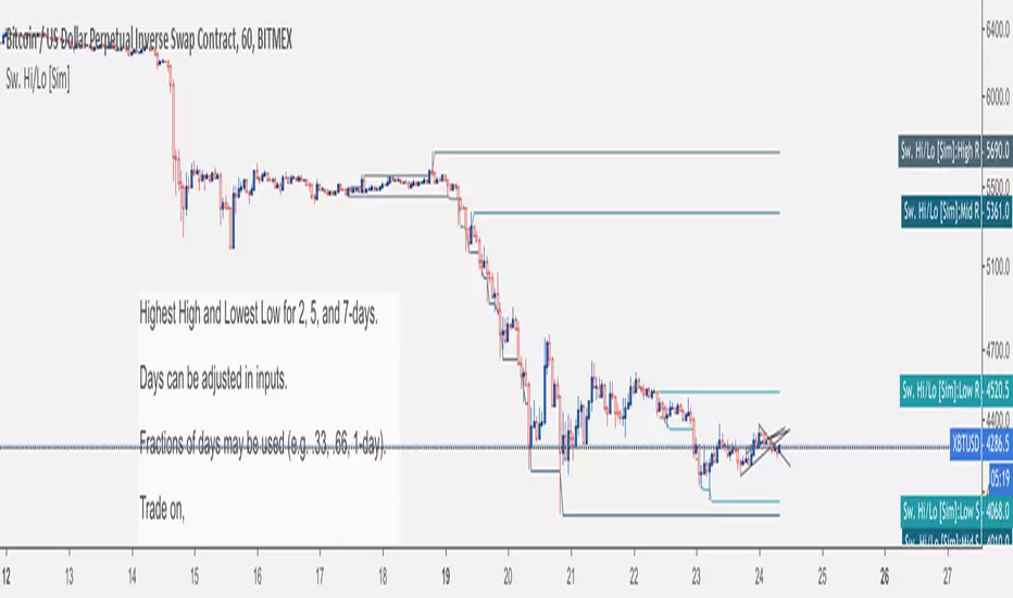 This script finds the highest high and lowest low for 3 seperate lookbacks. By default, the lookbacks are 2, 5, and 7-days. Fractions of days may be used (e.g. .33, .66, 1-day). These can all be adjusted in the inputs section.
