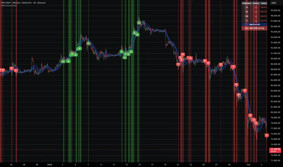 MA Smart Sync determines the market bias by evaluating the price position relative to a moving average channel on four independent timeframes and returning a confluence signal when a configurable number of them agree.