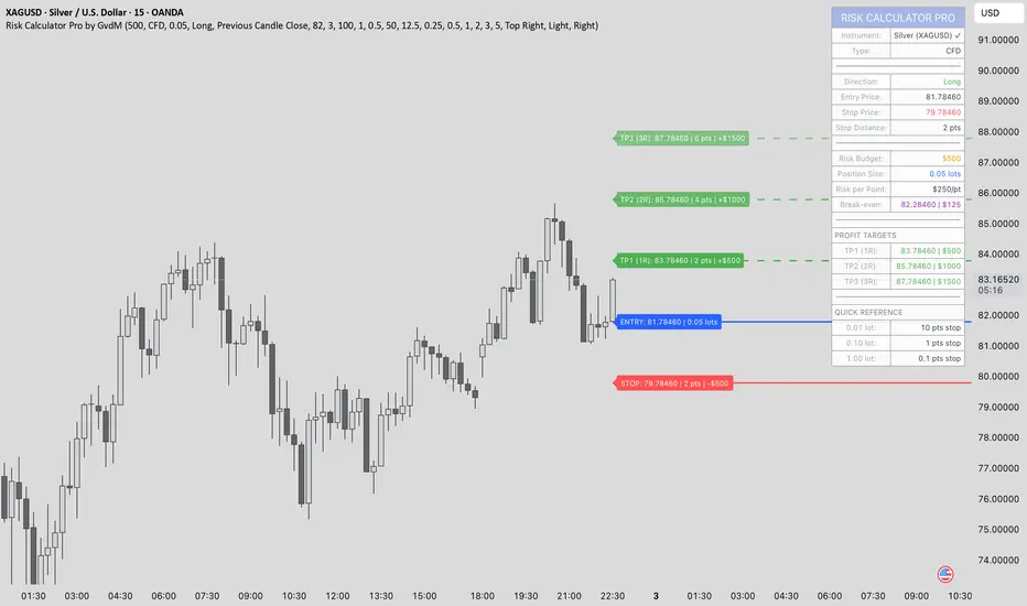 Risk Calculator Pro - Professional position sizing tool for CFD and CME futures traders. Automatically calculates lot size or contracts based on your risk budget and stop distance. Features auto-detection of popular instruments (Gold, Silver, Oil, Indices), multiple entry modes (current price, manual, previous candle, swing points), and visual profit targets with customizable risk:reward ratios. Displays comprehensive risk table and price level lines with smart labels showing points/ticks and position size. Perfect for disciplined risk management across any timeframe.
