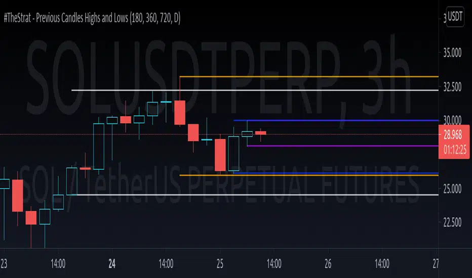 Anyone who has watched Sara's videos teaching the strat can see how she uses the highs and lows of her major time periods, the monthly, weekly, and daily, to find entries from her lower time periods to trigger her higher timeframes. This script performs the process of marking the highs and lows of 4-major time periods automatically so that you do not need to mark every single chart you use manually. I have found this script to be very useful, and convenient. I hope that other stratters find it as useful as I am. Below outlines how to use this, although it is mostly self-explanatory. Special thanks and credit to millerrm, who I used his original code snippets to rework his original script to something more tailored to my personal use cases.