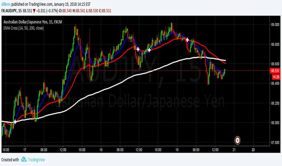 Exponential Moving Average (EMA) 14, 50 & 200 (default values) with cross indication of 14/50 and vice versa.