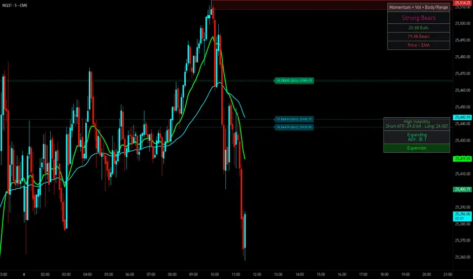 This script plots in real time a shorter period ATR compared to a longer period ATR allowing one to see if the market has above or below average volatility. This helps avoid choppy sideways markets.