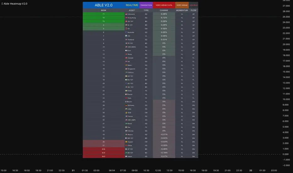 The Able Global Macro Heatmap V2.0 is a comprehensive multi-asset monitoring system that tracks 40 global instruments across equities, bonds, currencies, and commodities in real-time. It provides institutional-grade market regime detection, breadth analysis, and momentum scoring to help you understand global market dynamics at a glance.