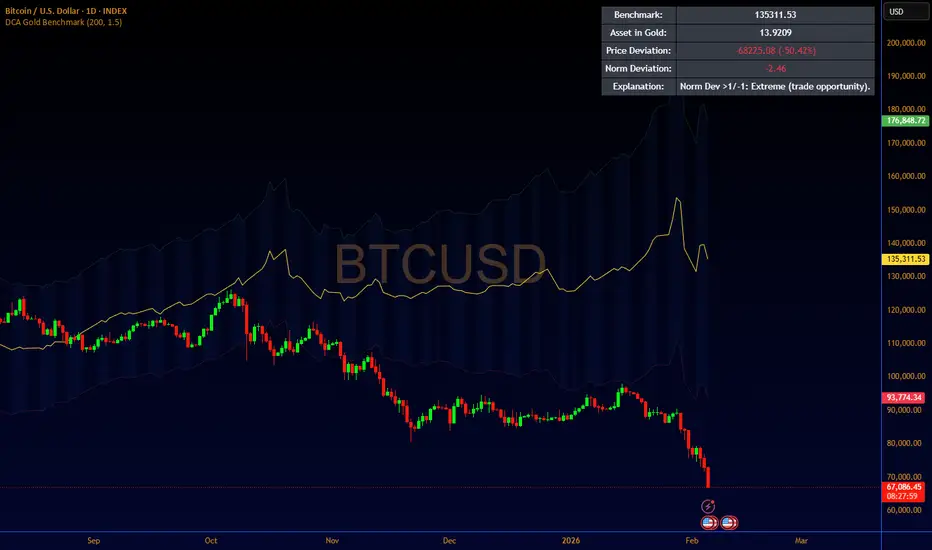 The DCA Gold Benchmark indicator provides a relative valuation tool for assessing an asset's price (such as stocks, cryptocurrencies, commodities, bonds, or forex pairs) against gold priced in the chart's quote currency, treating gold as a reference for value preservation.