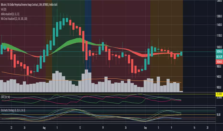 Colorizes red/green for simple cross of two moving averages (select ema or sma).