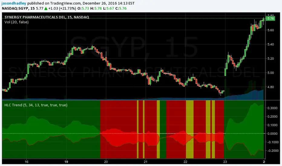 Identifies trends based on a comparison of a High, Low, and Close moving average.