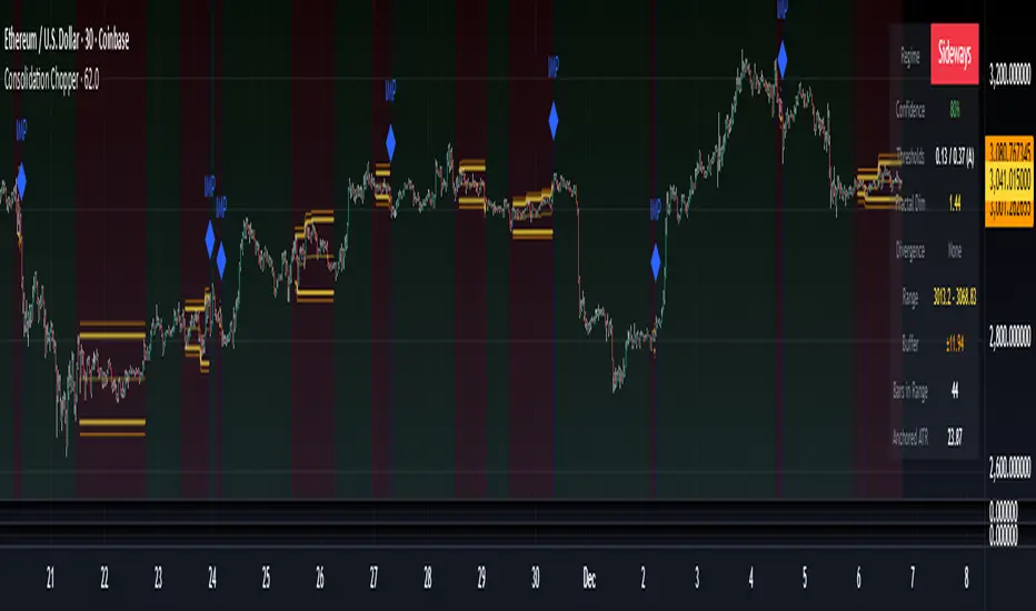 Consolidation Chopper is a regime detection indicator designed to identify whether the market is currently in a consolidation (sideways) phase or a trending phase. The indicator uses a proprietary multi-timeframe approach to analyze price action across different windows, providing a more robust classification than single-timeframe methods.