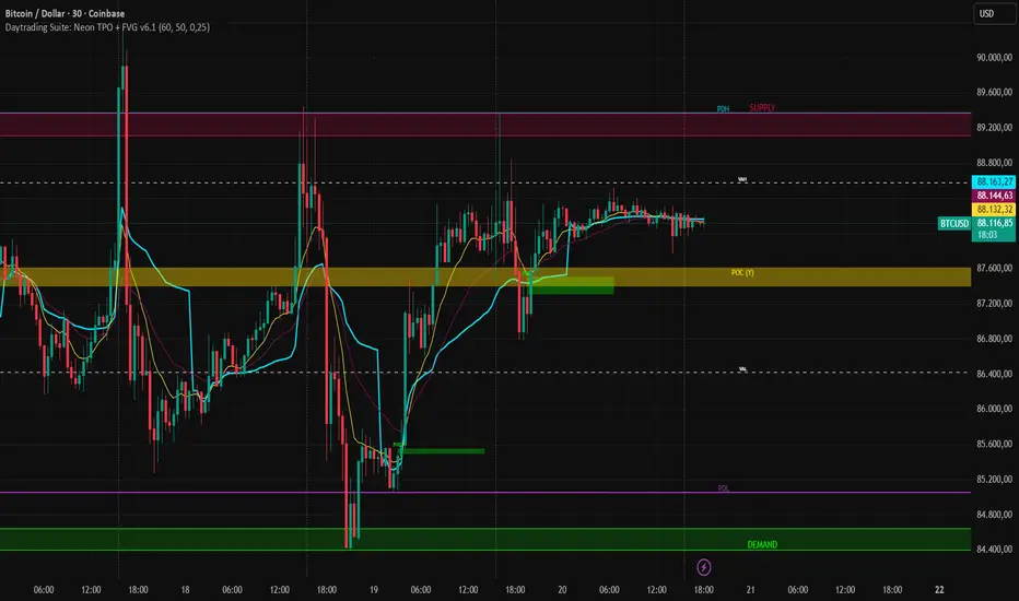 * **In "No Man's Land":** If the price is sitting right in the middle between Gold (POC) and White (VAH/VAL), do nothing. The risk is 50/50. Wait until price hits an edge.