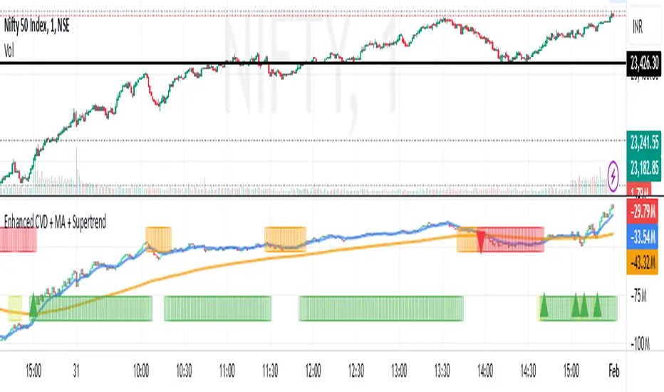 This advanced indicator combines Cumulative Volume Delta (CVD) analysis, multiple moving averages, and Supertrend signals to create a comprehensive trading tool. Designed for both day traders and swing traders, it helps identify volume-driven market momentum while confirming trends through price action.