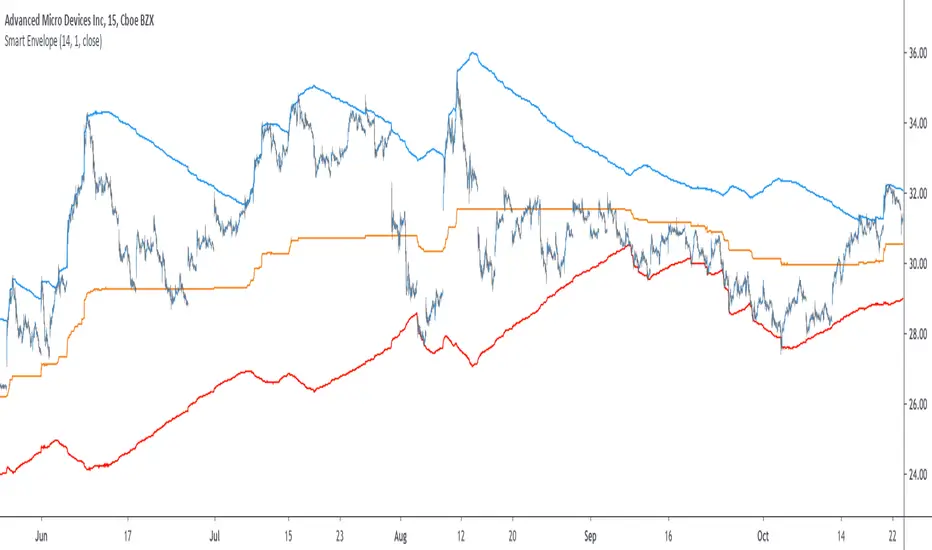 Envelopes indicators consist in displaying one upper and one lower extremity on the price chart. They are most of the time built by adding/subtracting a volatility estimator (rolling stdev, atr, range...etc) to a central tendency estimator (SMA, EMA, LSMA...etc). Their interpretation is often subject to debate amongst technical analyst, some will use a support and resistance methodology, where price will start a downtrend once it cross the upper extremity, and a down trend once it cross the lower one. Others will prefer a breakout methodology, where price will reach higher highs once it cross the upper extremity, and lower lows when it cross the lower one. Because of price non stationarity its hard to select the best methodology, the support and resistance one will mostly work on ranging markets, while the breakout methodology mostly work on trending ones.