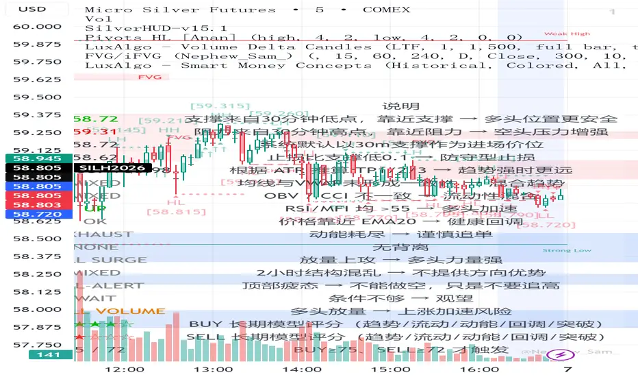 Silver HUD v15.1 is a comprehensive Pine Script v5 indicator designed for micro silver futures (SIL) trading on TradingView. It overlays a 3-column HUD table displaying real-time analysis across multiple engines including trend, flow, momentum, pullback, turbo (breakout), divergence, volume, and 2H structure. The system generates weighted BUY/SELL scores and final signals with risk warnings, optimized for 5m charts with 30m support/resistance levels.