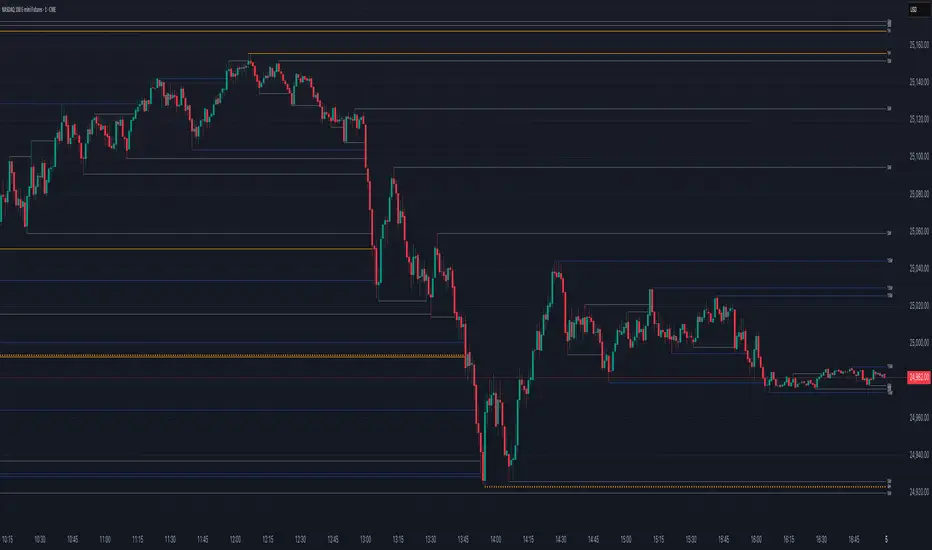Identify and display swing highs and lows across multiple higher timeframes on a chart, overlaying horizontal lines and customizable labels at these swing points.