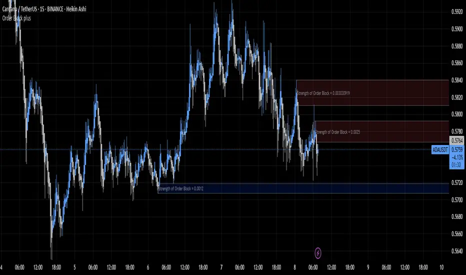 Indicator Description: “Order Block Plus”This indicator is designed for traders who aim to identify the strength and position of supply and demand zones on the chart and receive key signals for entry or exit. Below is a detailed explanation of its functionality: