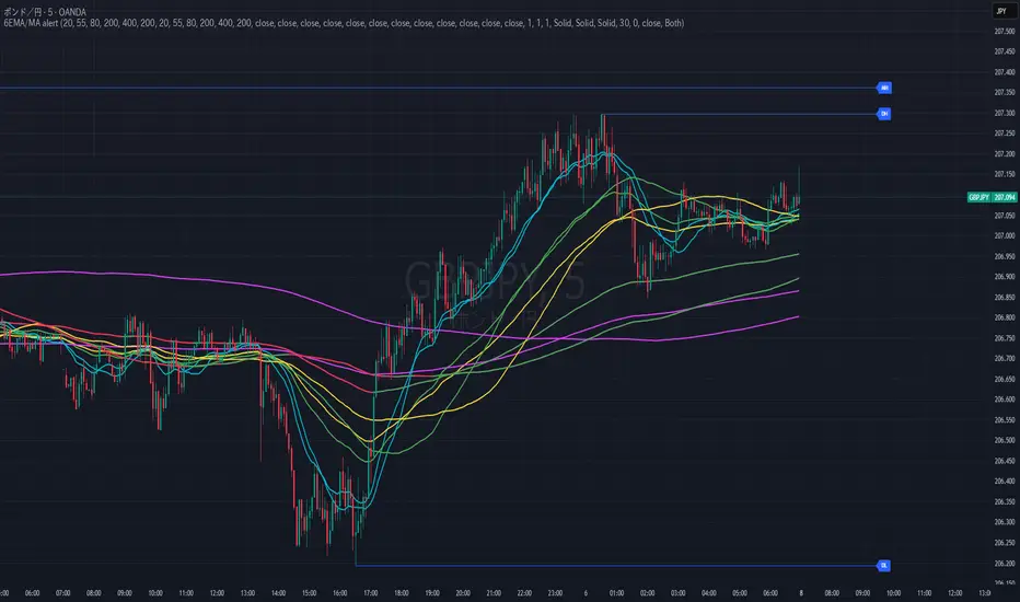 This indicator is designed to combine multiple moving averages, higher-timeframe levels, and flexible alerts into a single tool. It helps you monitor trend direction, dynamic support/resistance, and key daily/weekly/monthly levels without loading several separate indicators.