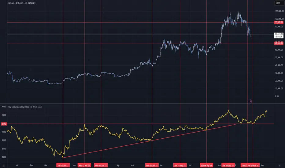 This indicator is an adaptation of the original "M2 Global Liquidity Index" created by Mik3Christ3ns3n. Full credit for the original concept and implementation goes to the original author. This version simply adds a 10-week forward projection to the existing calculations.
