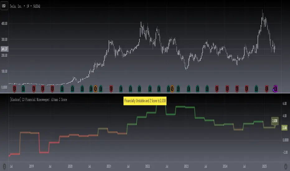 OVERVIEWThe [blackcat] L3 Financial Minesweeper: Altman Z Score indicator assesses the financial health of a company using the Altman Z-Score model. This model combines various financial ratios to predict the likelihood of bankruptcy or financial distress. The indicator plots the calculated Z-Score on the chart and provides visual feedback on the company's financial status, helping traders make informed decisions about their investments 💼📉.