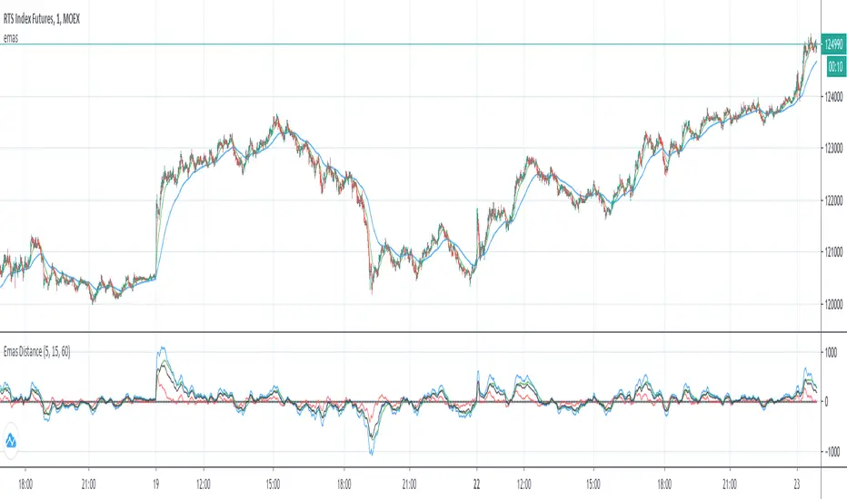 This oscillator calculates a distance between EMA's and plots it in a way Alligator is plotted.