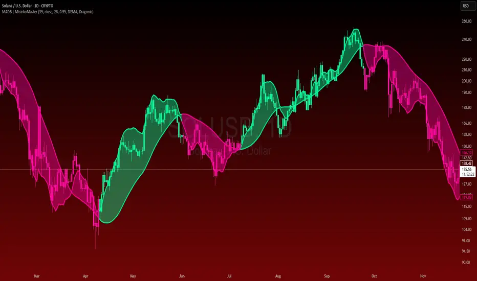 The Moving Average Divergence Bands are a new trend following tool designed for catching ALT coin trends quickly, while filtering away false signals.