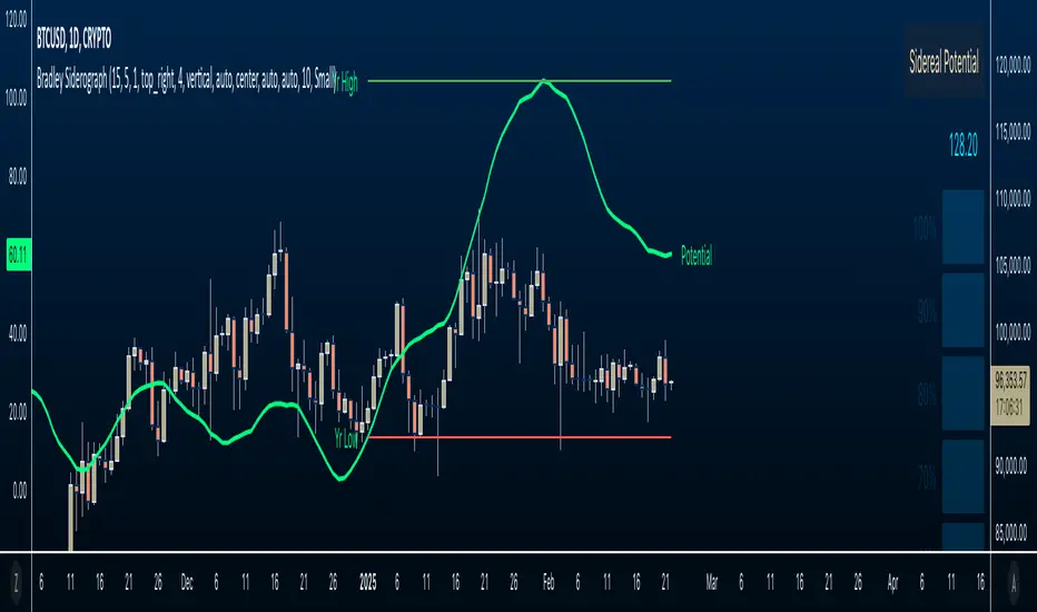 The indicator also marks the yearly high and low of the current year’s sidereal potential, providing a reference for when the market is trading above or below key levels. This feature was inspired by an observation made by Bradley in his book, which I wanted to incorporate here.