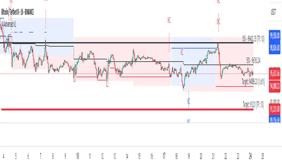 • Visual elements (initiatives, levels, targets) are shown for two timeframes at once: the current chart timeframe and a higher timeframe of your choice.