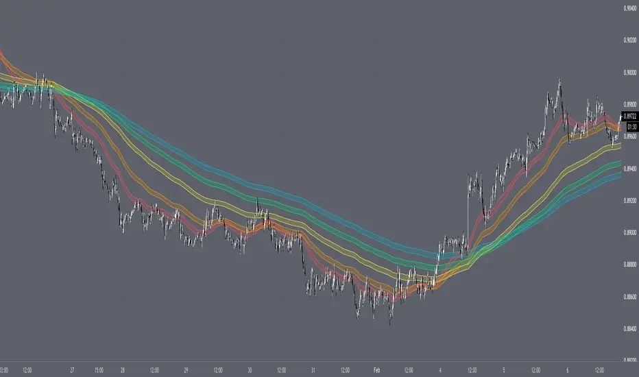 Just a very simple EMA fan using Highs and Lows instead of closes. This results in these "EMA noodles". Price very rarely reacts rigidly to a close price of an EMA, sometimes it comes short, other times it overshoots it. Hence the idea behind the noodles.