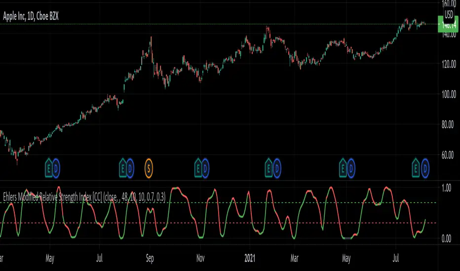 The Modified Relative Strength Index was created by John Ehlers (Cycle Analytics For Traders pgs 87-88) and this is a typical RSI that uses his roofing filter as the input. He smooths it with his own super smoother filter to provide signals. This indicator is extremely reactive and works in cycles so keep that in mind. I haven't been able to come up with clear buy and sell signals at this point so let me know if you any suggestions but I'm publishing the code to complete my goal of publishing all of his work one day. I will be publishing a bunch of Ehlers scripts in the next few weeks so stay tuned. What I recommend for buy and sell signals at this point are to buy when the indicator goes below the oversold line and starts going up and sell when the indicator goes below the oversold line a second time. Vice versa for sell signals.