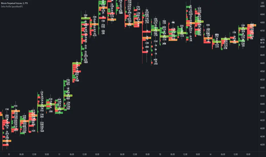Delta Profile SpaceManBTC, provides 2 very useful functions to tradingview traders with increased statistic for their candles in which case they can use to add confluence to their trading style.