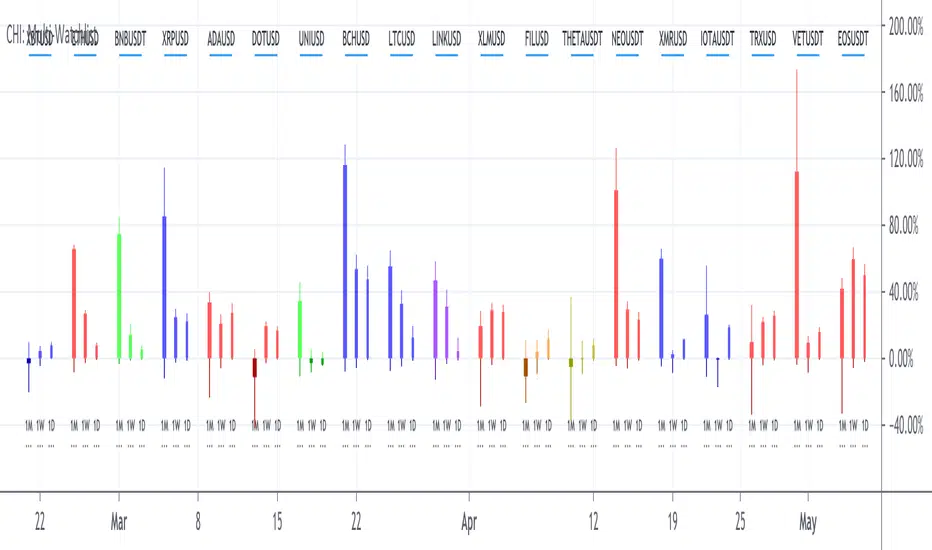 - The indicator allows up to 20 individually selected ticker symbols classifiable into up to 6 separate groups with up to 12 different selectable time periods (including a custom time period) to be displayed.