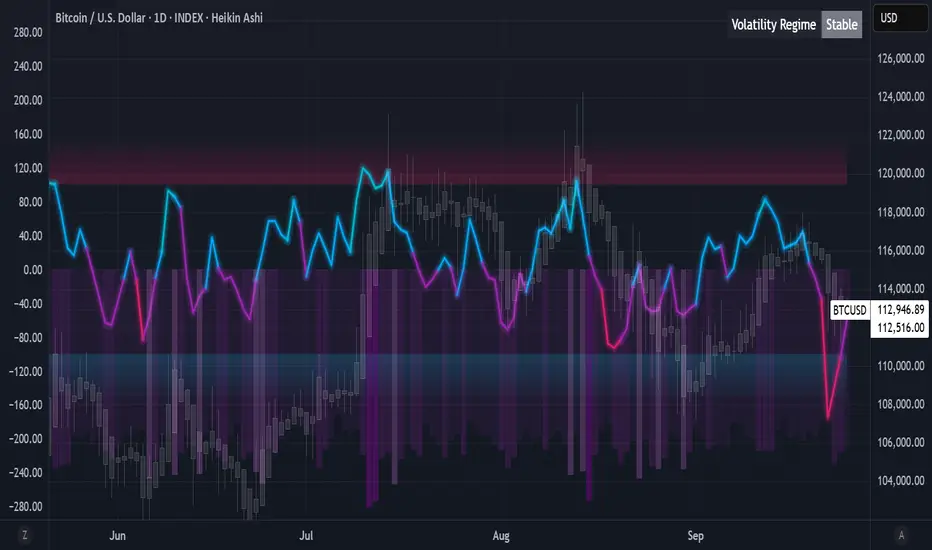 2. Dynamic Volatility Histogram: This histogram at the bottom of the indicator is a custom volatility meter. It has been engineered to be adaptive, ensuring that the visual differences between high and low volatility are always clear and dramatic, no matter your zoom level. It uses a multi-color gradient to visualize the intensity of market volatility.