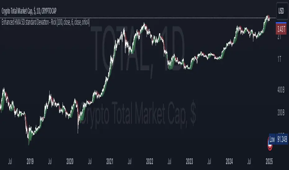 Simple hull moving average enhanced with standard deviation bands calculated over a 5 day period to account for volatility in ranging periods.