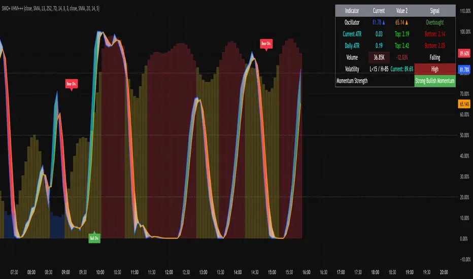 This is a comprehensive volatility + momentum + volume + ATR dashboard with table visualization, momentum ribbon, and divergence detection. It’s optimized for visual clarity with dynamic coloring and is suitable for both trend-following and mean-reversion traders.