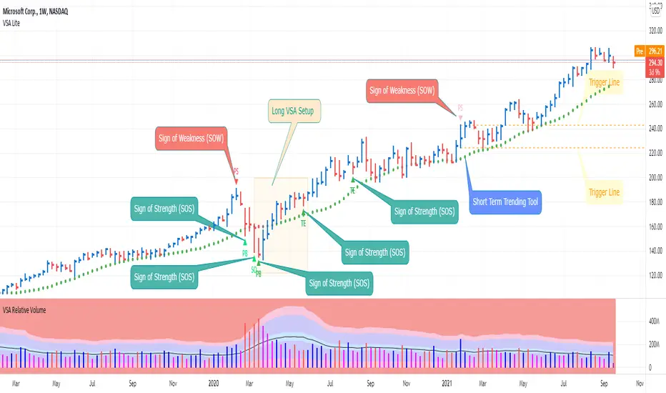 The TradeGuider VSA Lite indicator provides information about the imbalance between supply and demand on the price charts via VSA principles. The VSA principles introduced in this indicator can be divided into two groups: Signs of Strength (SOS) and Signs of Weakness (SOW). The following six VSA principles are implemented: