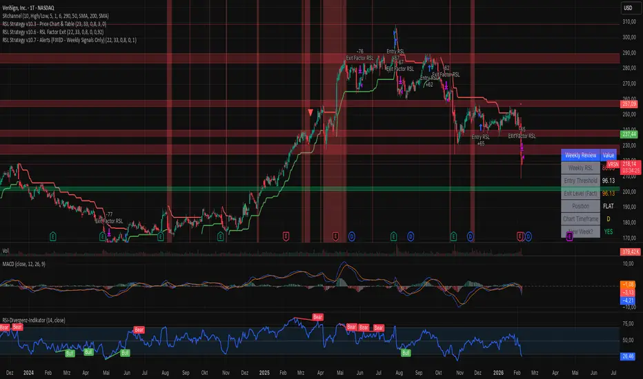 SMA + Standard\ Deviation$) to ensure entries occur during periods of statistically significant strength.VIX Risk Filter: A built-in "Fear Limit" that prevents new entries when market volatility (VIX) exceeds a user-defined level (default: 22), protecting the capital during market-wide turbulence.Adjustable Exit Factor: A unique Exit Threshold Factor allows traders to fine-tune the exit sensitivity. Setting the factor below 1.0 gives the trade more "room to breathe," while a factor above 1.0 tightens the exit for faster profit-taking.Velocity Filter: Ensures momentum is accelerating by requiring a minimum rise in RSL over a 4-week lookback period before entering.Visual Monitoring: Includes an on-chart Weekly Review Table that tracks real-time RSL values against dynamic entry and exit levels.How it WorksEntry: Triggered when the Weekly RSL crosses above the dynamic threshold, provided the VIX is low and momentum velocity is positive.Exit: Triggered when the RSL drops below the adjusted "Exit Level," calculated as the dynamic threshold multiplied by your custom Factor.