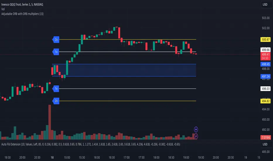 "Adjustable ORB with ORB Multipliers," calculates and visually represents the Opening Range Breakout (ORB) based on a user-defined timeframe (defaulting to 15 minutes). It identifies the high and low of the opening range and shades the area between these levels in blue for clear visualization. The indicator then computes additional levels at multiples of the opening range—specifically 1x and 2x the range distance above and below the ORB. These multiplier levels are plotted on the chart (with white lines for 1x levels and yellow lines for 2x levels) and are labeled accordingly ("1x" and "2x") on the left side of each line for easy reference. Users can choose to display or hide the 1x and 2x levels through input options, allowing for customization based on trading preferences. This tool aids traders in identifying potential breakout zones and setting target levels based on the initial market movement of the day.