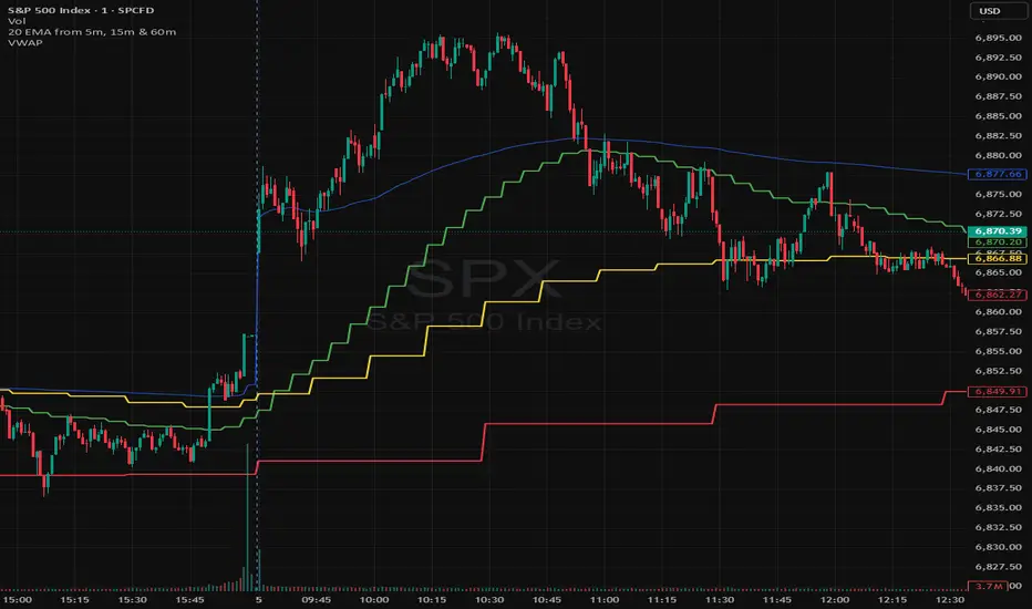 This indicator displays the 20-period EMA calculated from higher timeframes while trading on the 1-minute chart.It plots:
