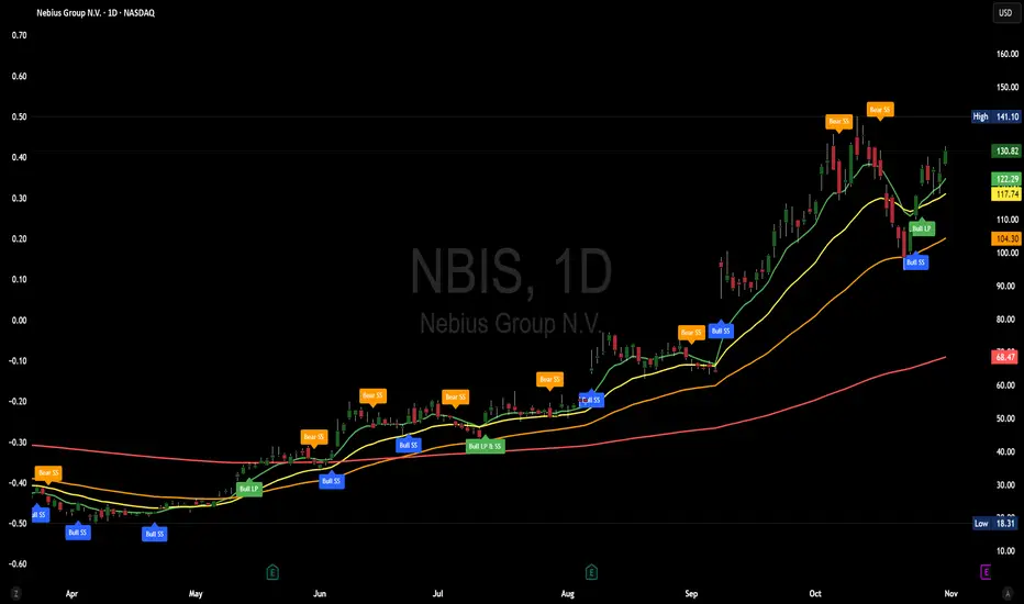- Bear LP: Short entry on downside crossover with falling shortest MA (red label).