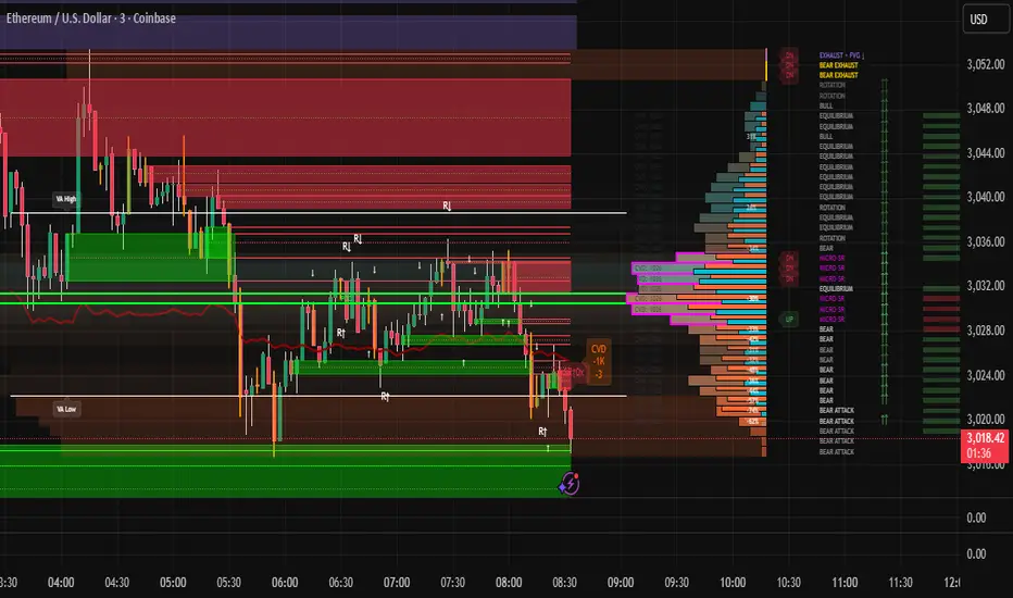 Historical labels (BULL/BEAR/EQUILIBRIUM) display for inactive zones. Real-time overrides activate only when price is within 1.5 bins of the level, providing instant feedback on what institutions are doing RIGHT NOW at each price level.