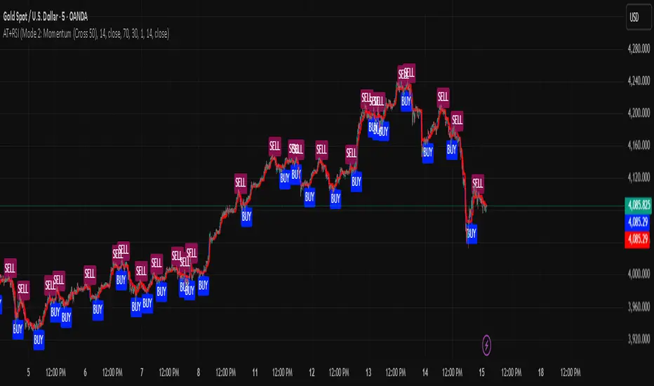 Mode 2 - Momentum: Buy alerts appear when RSI is above 50 (bullish momentum), sell alerts appear when RSI is below 50 (bearish momentum). This helps confirm trend direction.