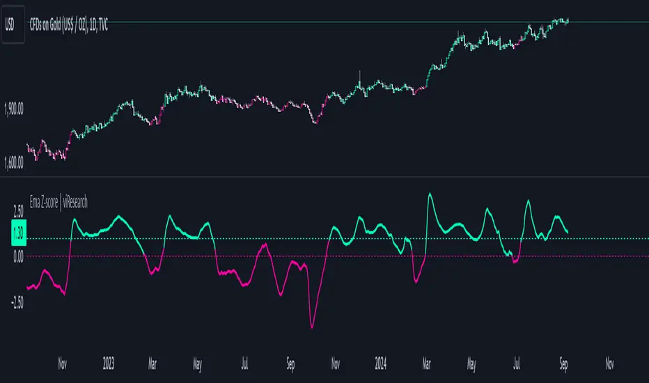 The "Ema Z-score | viResearch" indicator offers a unique combination of EMA smoothing and Z-score analysis, giving traders a statistical measure of price deviations and improving their ability to detect overbought or oversold conditions, trend reversals, and trend confirmations. By incorporating this script into your trading strategy, you can better quantify price extremes and make more informed decisions in both volatile and stable markets. Whether you're focused on spotting early reversals or confirming ongoing trends, the "Ema Z-score" provides a reliable and customizable solution.