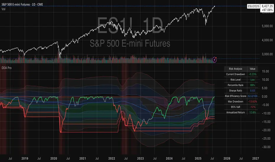 The Drawdown Distribution Analysis indicator implements quantitative risk management principles, drawing upon decades of academic research in portfolio theory, behavioral finance, and statistical risk modeling. This tool provides risk assessment capabilities for traders and portfolio managers seeking to understand their current position within historical drawdown patterns.