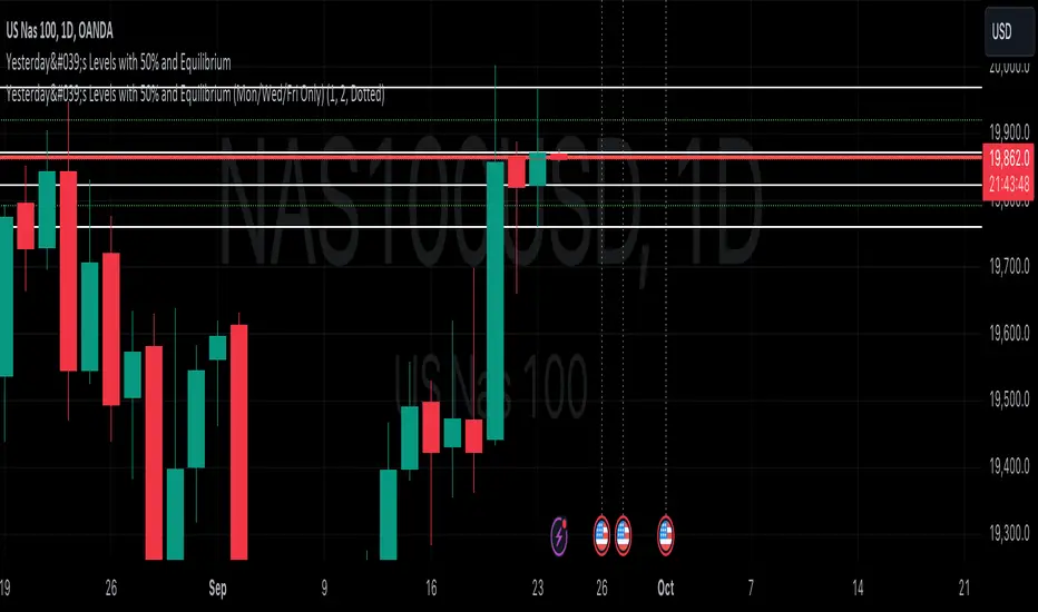 # Indicator: "Yesterday's Levels with 50% and Equilibrium"This indicator helps traders by automatically plotting key levels from the previous day's candle on their charts. It provides a clear visual reference to important price levels that can be used for making trading decisions on any timeframe. The following key features are included: