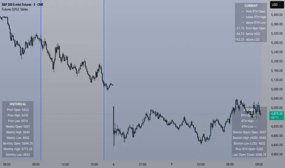 Adds (up to) 3 tables to a chart, displaying Open/High/Low data for today (RTH and extended hours), yesterday, and the current week / month -- to help with intraday analysis of a futures ticker.The CURRENT and SESSION tables only appear on intraday charts (5min, 30min, etc). On a Daily/Weekly/etc chart only the HISTORICAL chart shows -- the other two are not calculated or shown.