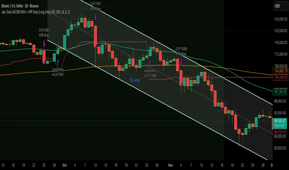 Simple long-only daily trend system that combines the classic 50/200 EMA trend filter with an ATR-based trailing stop. Built as a lab tool for studying daily swing trades on major crypto pairs.