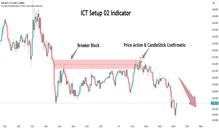 The ICT Setup 02 indicator designed to automate the identification of Bullish and Bearish Breaker Blocks. This tool enables traders to easily spot these blocks on a chart and utilize them for entering or exiting trades. Below is a breakdown of how to use this indicator in both bullish and bearish setups.