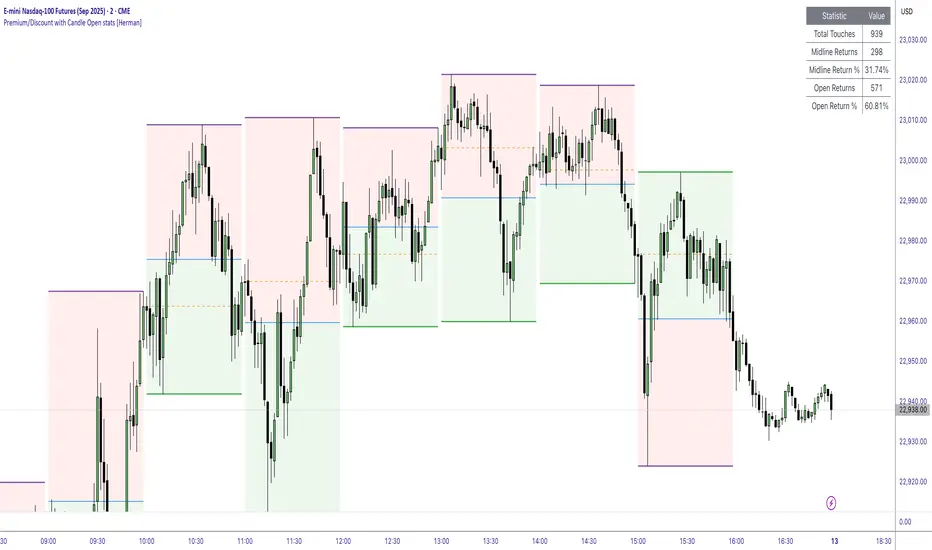 This indicator is designed to help traders identify and analyze premium/discount zones on any timeframe while automatically tracking statistics on price behavior relative to these zones. It is especially valuable for traders looking to structure entries, manage targets, and quantify market reactions to prior session ranges.